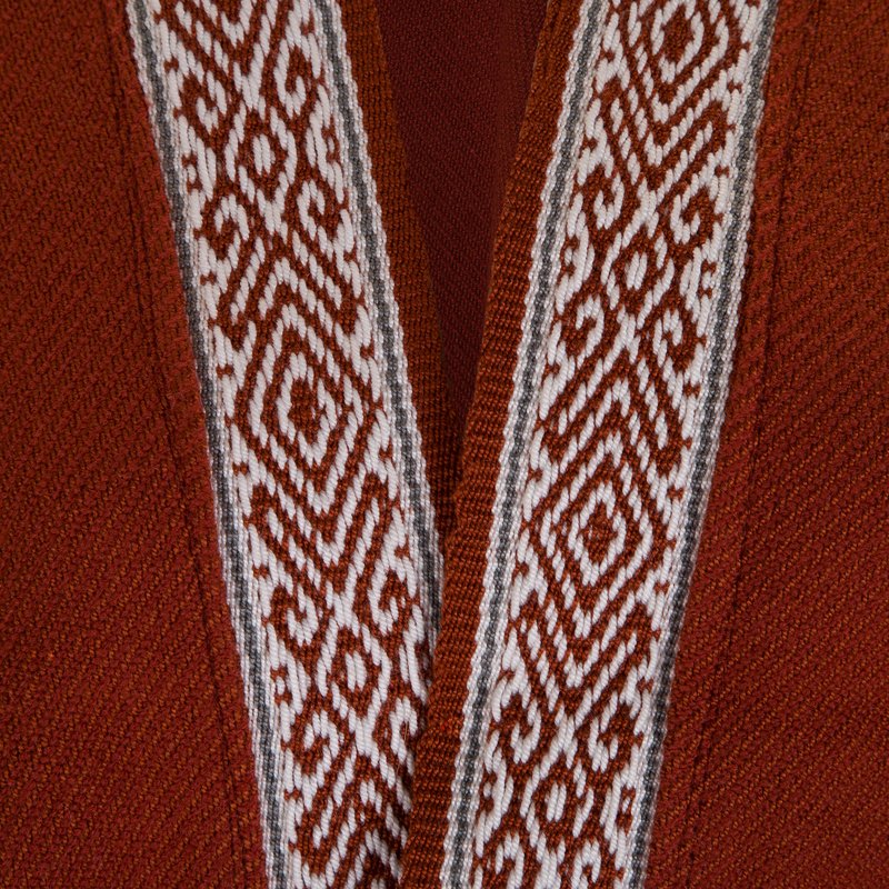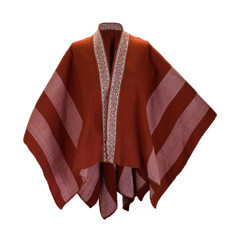 Ruana abierta en color café, con un diseño de franjas laterales color crudo. Una pieza de moda única, que rinde homenaje al tejido tradicional del pueblo de Los Pastos.